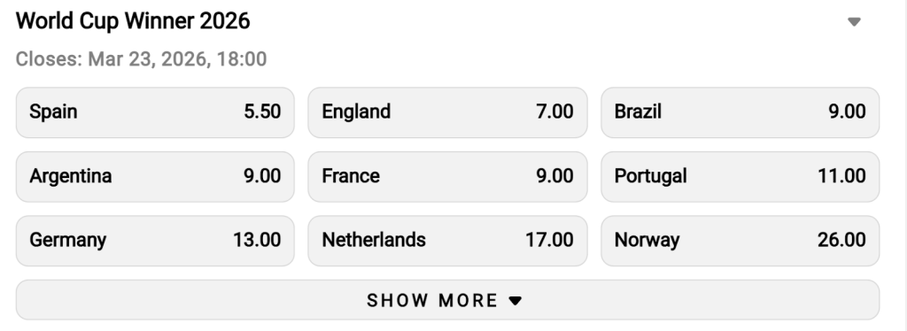 While Spain currently tops the odds board screenshot from WRbet (registration link)