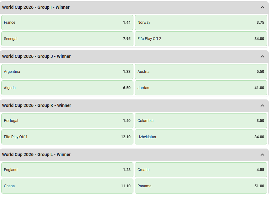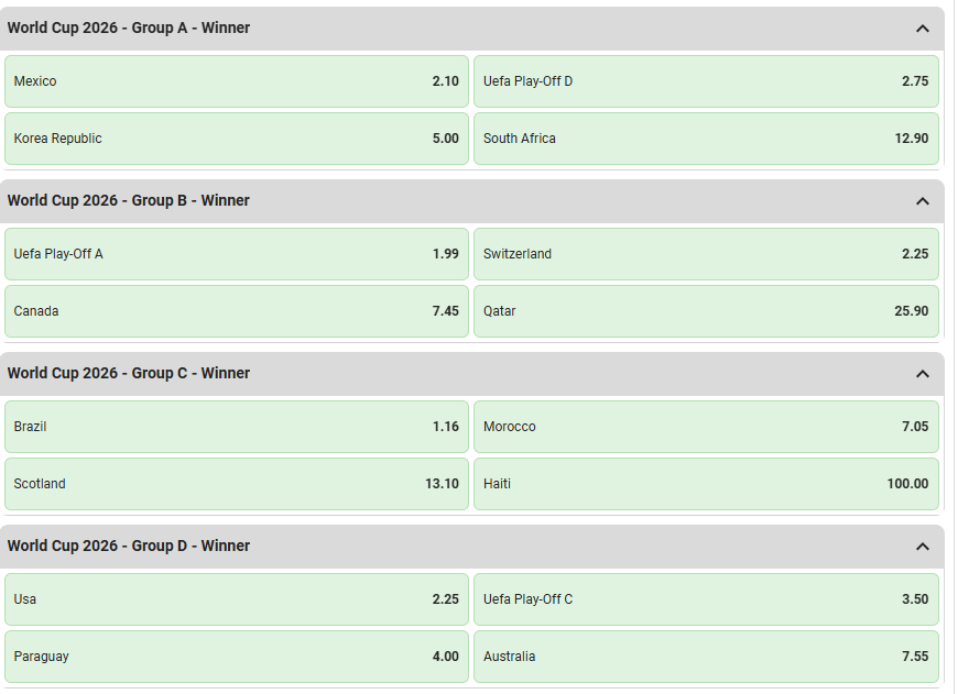 Punters will place bets on the team they think will top the group after playing the other three teams in the group
