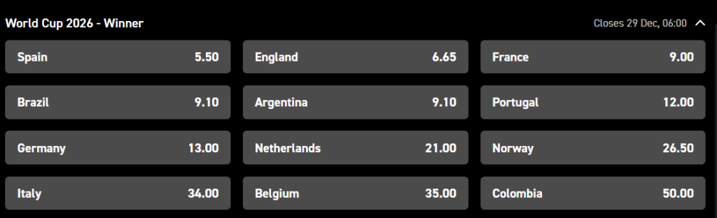 However, the margins are incredibly small between the top five teams as England follows Spain closely in the odds, while France, Brazil and Argentina are all 8/1 to win the World Cup. This suggests there is no single runaway favourite, and form closer to the tournament will be critical.