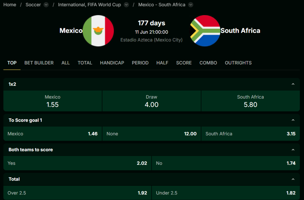 Despite their traditional strength in the CONCACAF region, current odds place them as a mid-tier favourite to win the opener against Bafana Bafana, sitting at 55/100 (1.55) at Mzansibet.com.