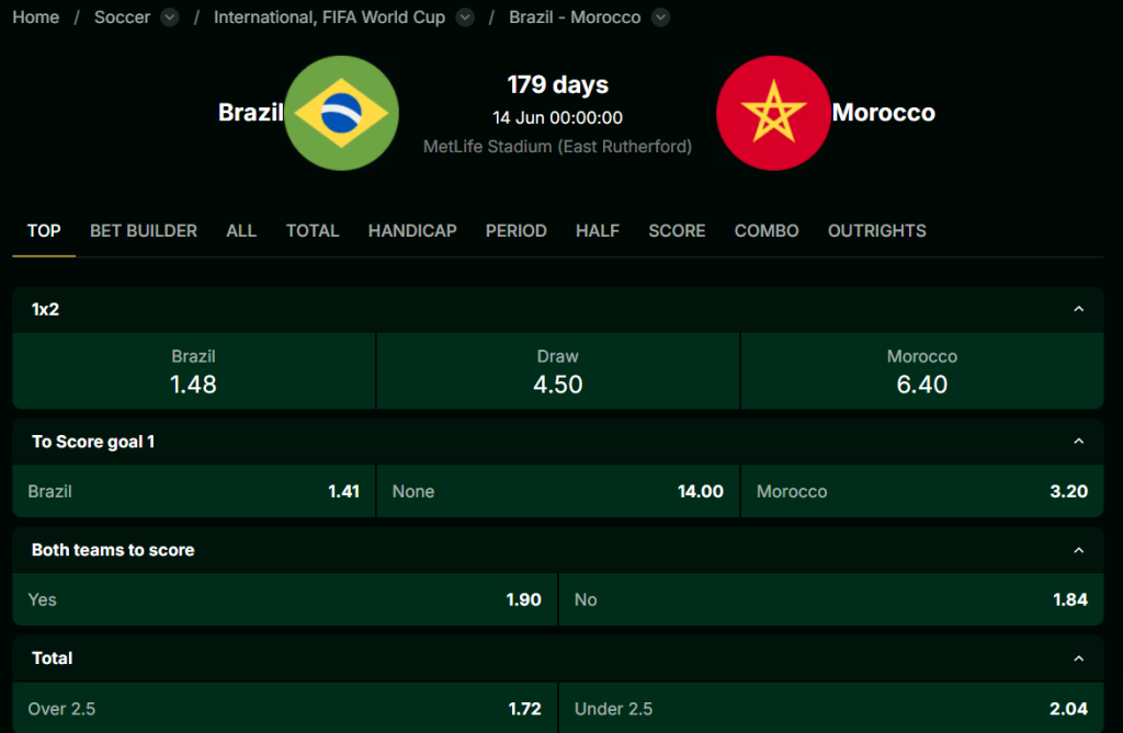 Under the new management of Carlo Ancelotti, Brazil will always be a top favourite. They will be keen to start strong, especially after their disappointing exit from the tournament in 2022. Early odds place them as heavy favourites for the match at 48/100 (1.48). Morocco should deploy a low block to mitigate conceding goals, making it difficult for Brazil to score.