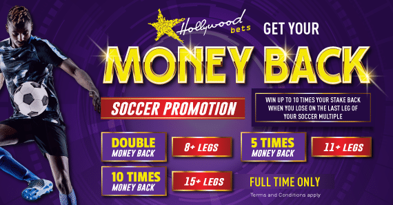 If you placed an accumulator bet and your bet loses in the last leg, Hollywoodbets will give you a cashback of your stake amount up to R5000. You can double your stake back up to R1000 if you have at least eight selections on your slip and minimum odds of 5/1 per leg.