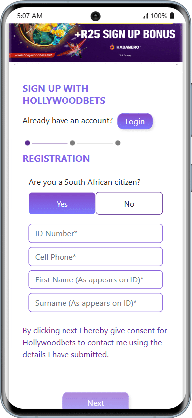 • You need to register on Hollywoodbets site, fill in your details by clicking on the ‘Join’ button.
