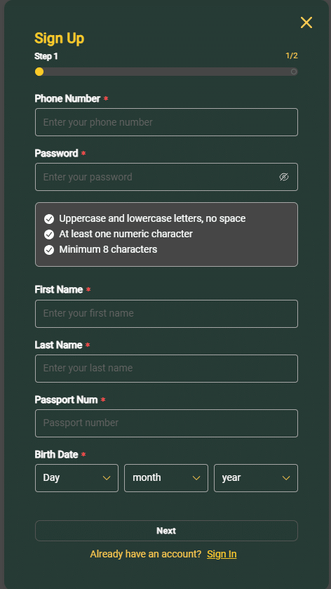 - In the first step, you’ll need to provide basic personal details, including your mobile number, chosen password, first and last name, ID or passport number, and your date of birth.