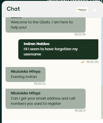 screen shot of the conversation with the Gbets agent