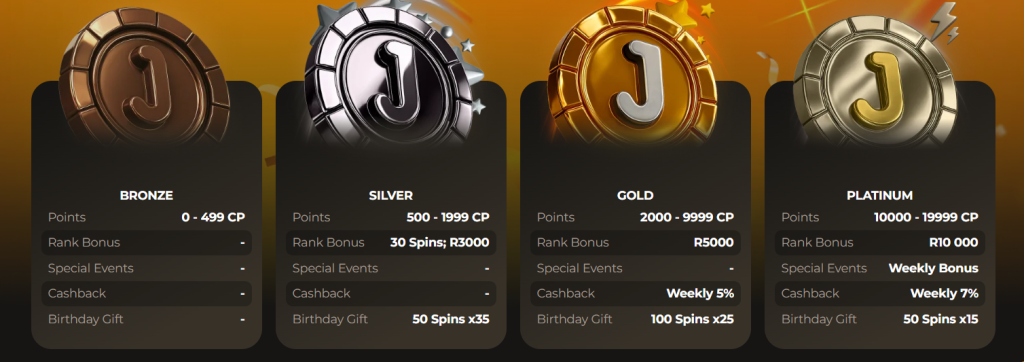 The bookmakers rewards long-time casino players with a loyalty program. Jabulabets offers a five-tiered loyalty program based on the amount of comp points the player receives. All tier levels are awarded birthday bonuses and free spins when depositing using their tier level bonus code, while higher levels are awarded the same and weekly cashbacks as a bonus.