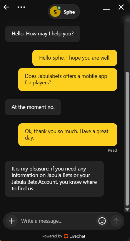 Jabulabets offers customer support to address queries related to your betting account, payments and deposits, as well as any gameplay concerns. Unfortunately, the customer support is not available 24/7. However, the FAQ page can be useful for answering most questions that players may have outside of customer support hours. Below are Jabulabets’ contact details for the available channels that players can use: